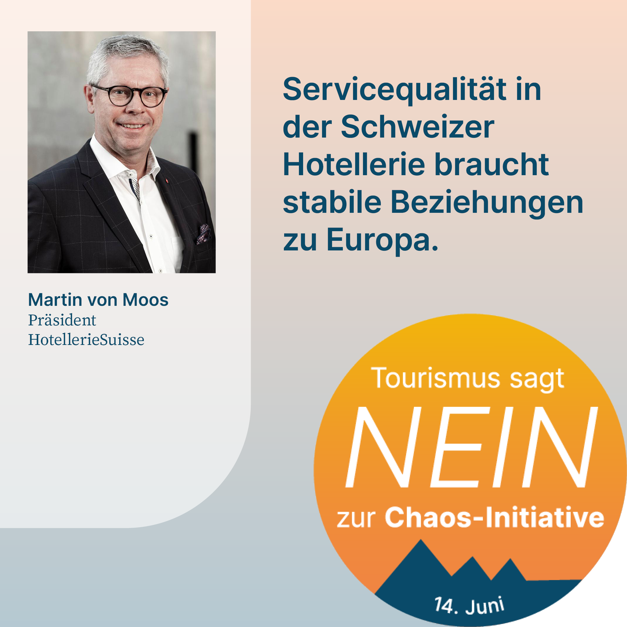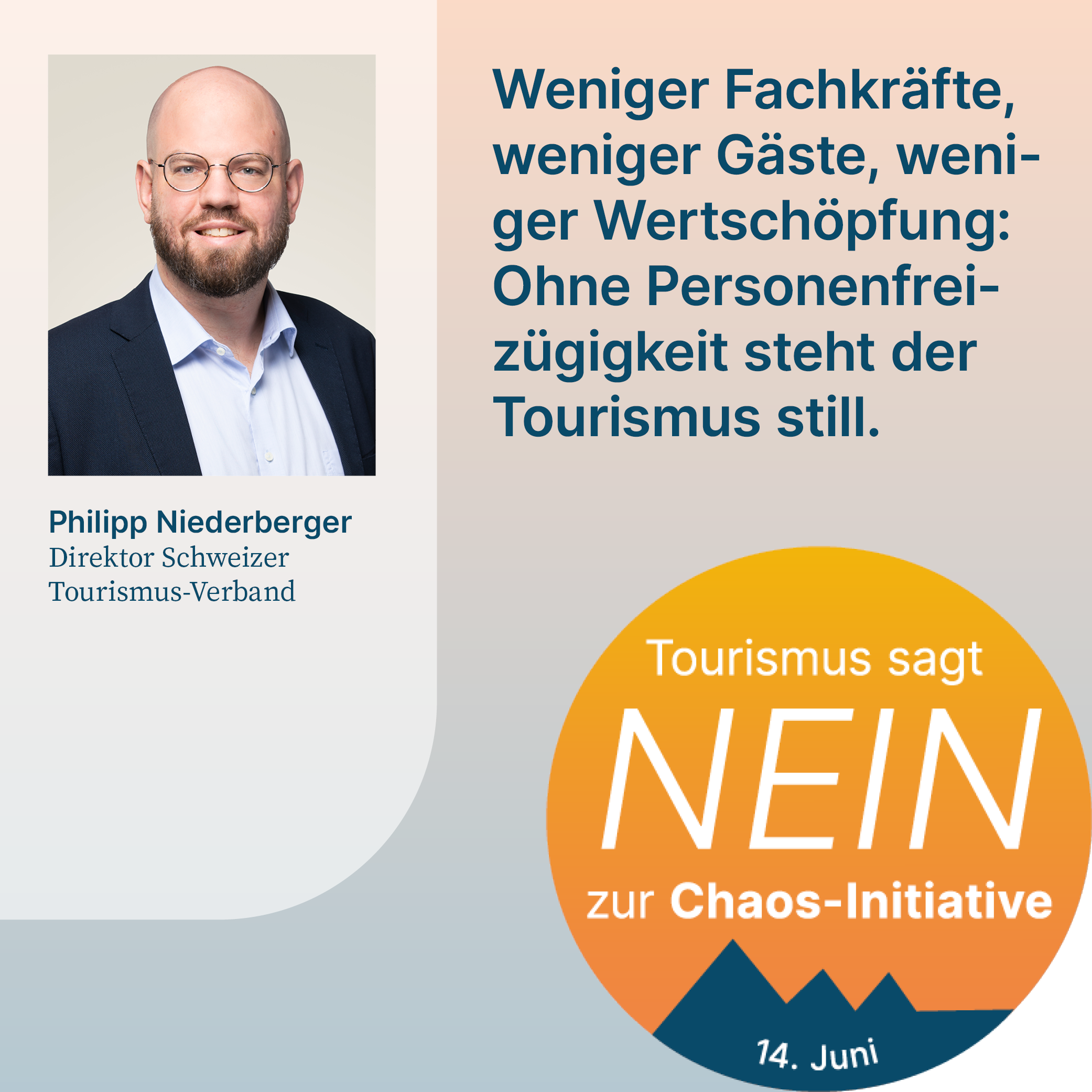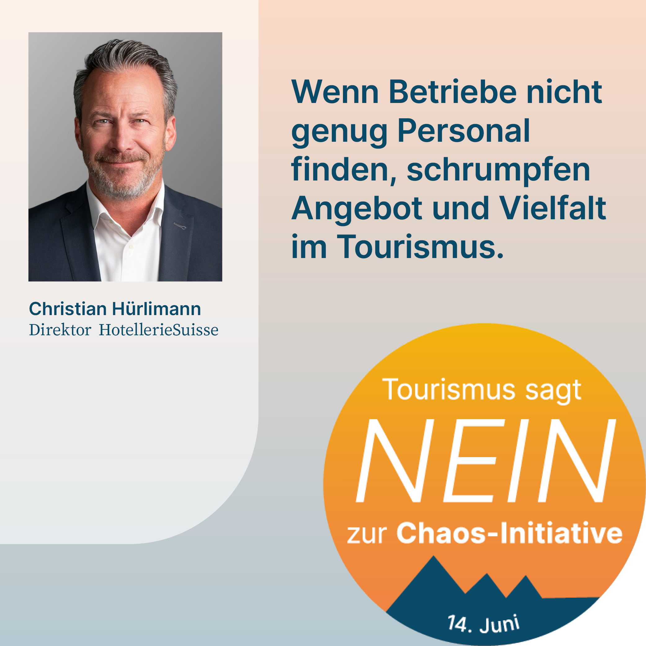 Die Chaos-Initiative, die am 14. Juni 2026 zur Abstimmung kommt, verlangt eine willkürlich gesetzte Obergrenze der Bevölkerungszahl in der Schweiz. Damit soll zukünftig die auf den Arbeitsmarkt ausgerichtete Migration unterbunden und der Wirtschaft wichtige Fachkräfte entzogen werden. Um die Obergrenze von zehn Millionen einzuhalten, müsste auch das Freizügigkeitsabkommen (FZA) mit der EU aufgekündigt werden. Aufgrund der Guillotine-Klausel werden bei einer Kündigung des FZA alle Abkommen der Bilateralen I hinfällig. Die Initiative gefährdet somit den bilateralen Weg der Schweiz als Ganzes. Für den Tourismus ist dieser jedoch von grosser Bedeutung. Die Rekrutierung von Fachkräften, die internationale Anbindung der Schweiz und der Zugang zum Binnenmarkt werden mit der Initiative bedroht. Die Annahme der Initiative würde der gesamten Schweizer Wirtschaft und insbesondere dem Tourismussektor grossen Schaden zufügen und ein grosses Chaos anrichten. Aus diesem Grund wird die Initiative als «Chaos-Initiative» bezeichnet.