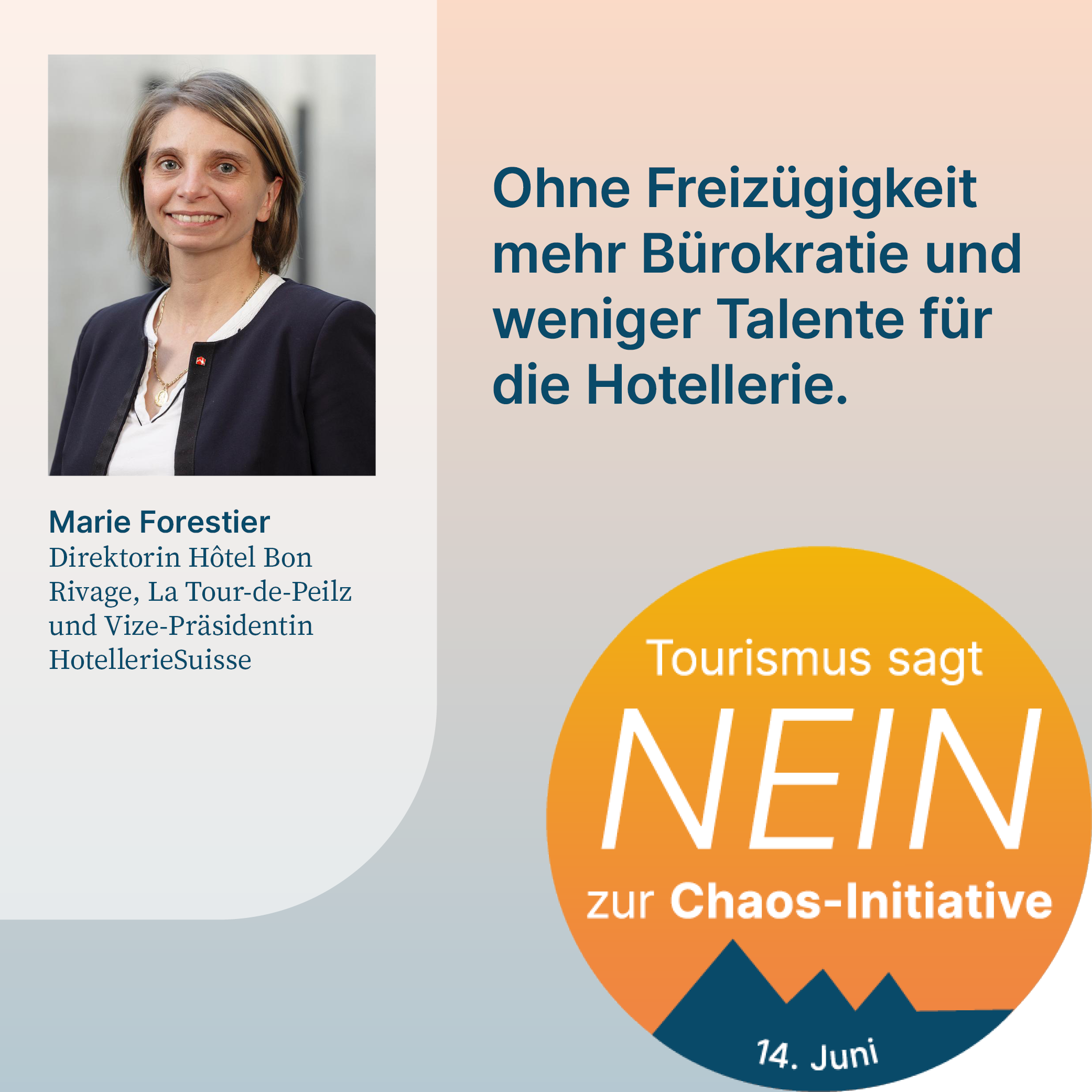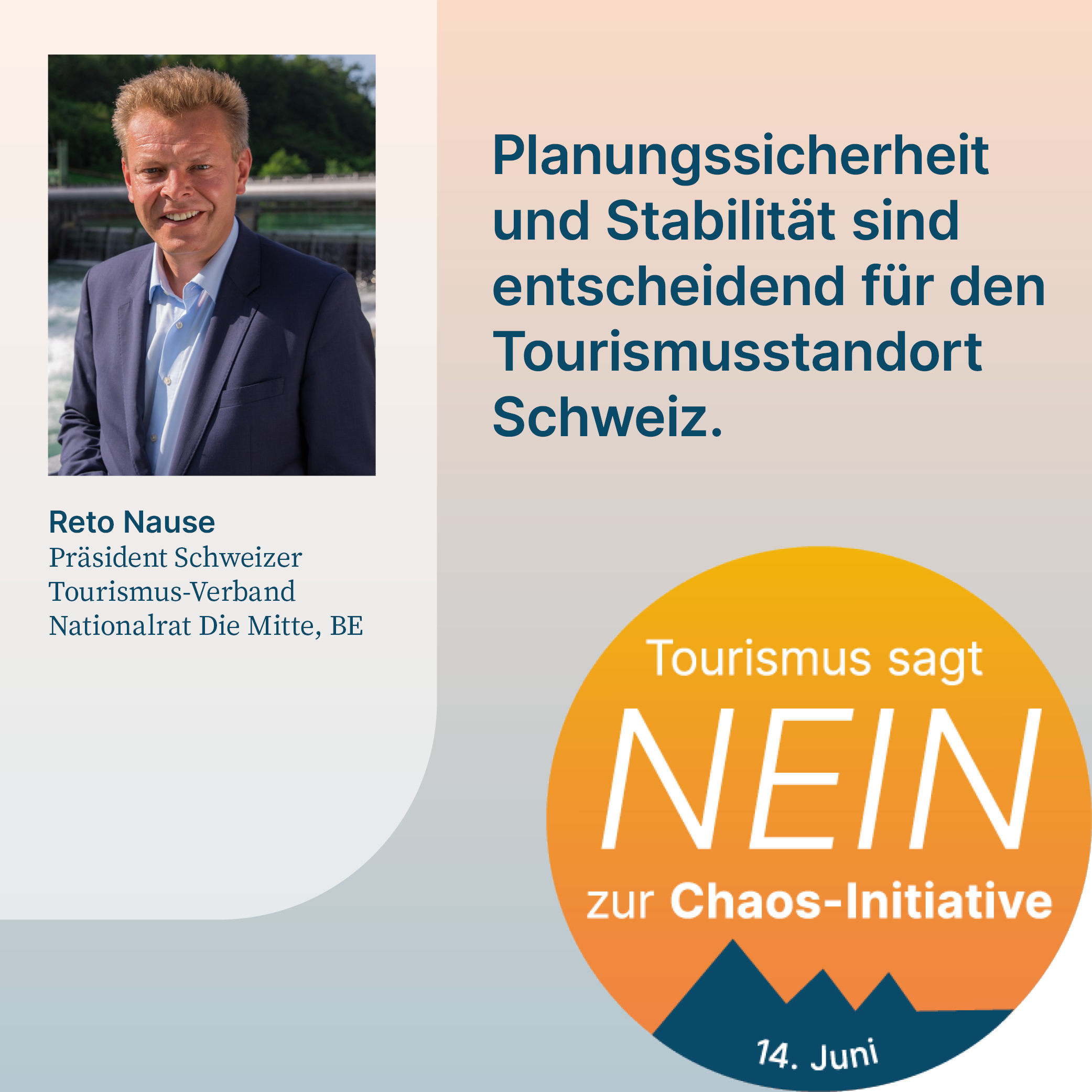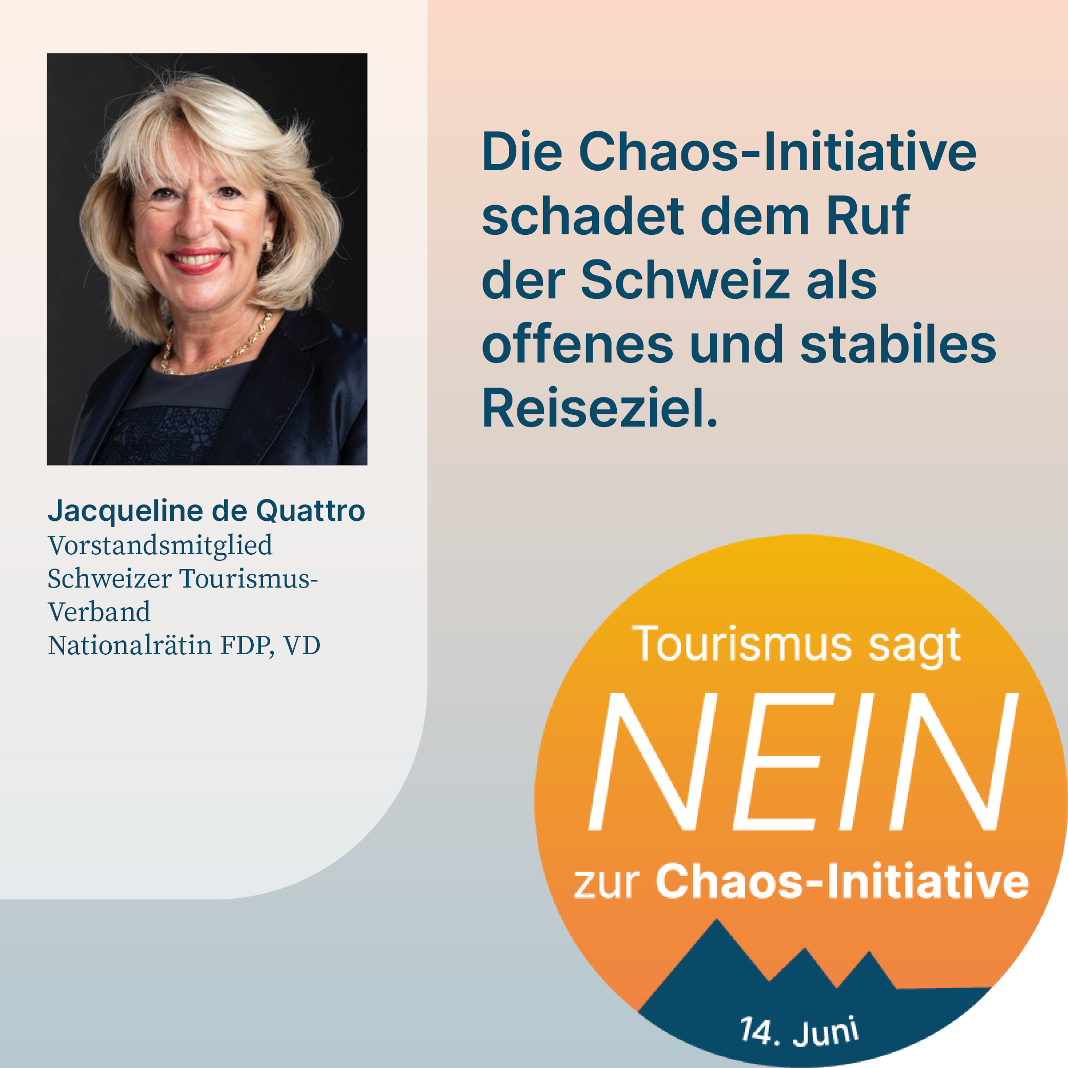 Die Chaos-Initiative, die am 14. Juni 2026 zur Abstimmung kommt, verlangt eine willkürlich gesetzte Obergrenze der Bevölkerungszahl in der Schweiz. Damit soll zukünftig die auf den Arbeitsmarkt ausgerichtete Migration unterbunden und der Wirtschaft wichtige Fachkräfte entzogen werden. Um die Obergrenze von zehn Millionen einzuhalten, müsste auch das Freizügigkeitsabkommen (FZA) mit der EU aufgekündigt werden. Aufgrund der Guillotine-Klausel werden bei einer Kündigung des FZA alle Abkommen der Bilateralen I hinfällig. Die Initiative gefährdet somit den bilateralen Weg der Schweiz als Ganzes. Für den Tourismus ist dieser jedoch von grosser Bedeutung. Die Rekrutierung von Fachkräften, die internationale Anbindung der Schweiz und der Zugang zum Binnenmarkt werden mit der Initiative bedroht. Die Annahme der Initiative würde der gesamten Schweizer Wirtschaft und insbesondere dem Tourismussektor grossen Schaden zufügen und ein grosses Chaos anrichten. Aus diesem Grund wird die Initiative als «Chaos-Initiative» bezeichnet.