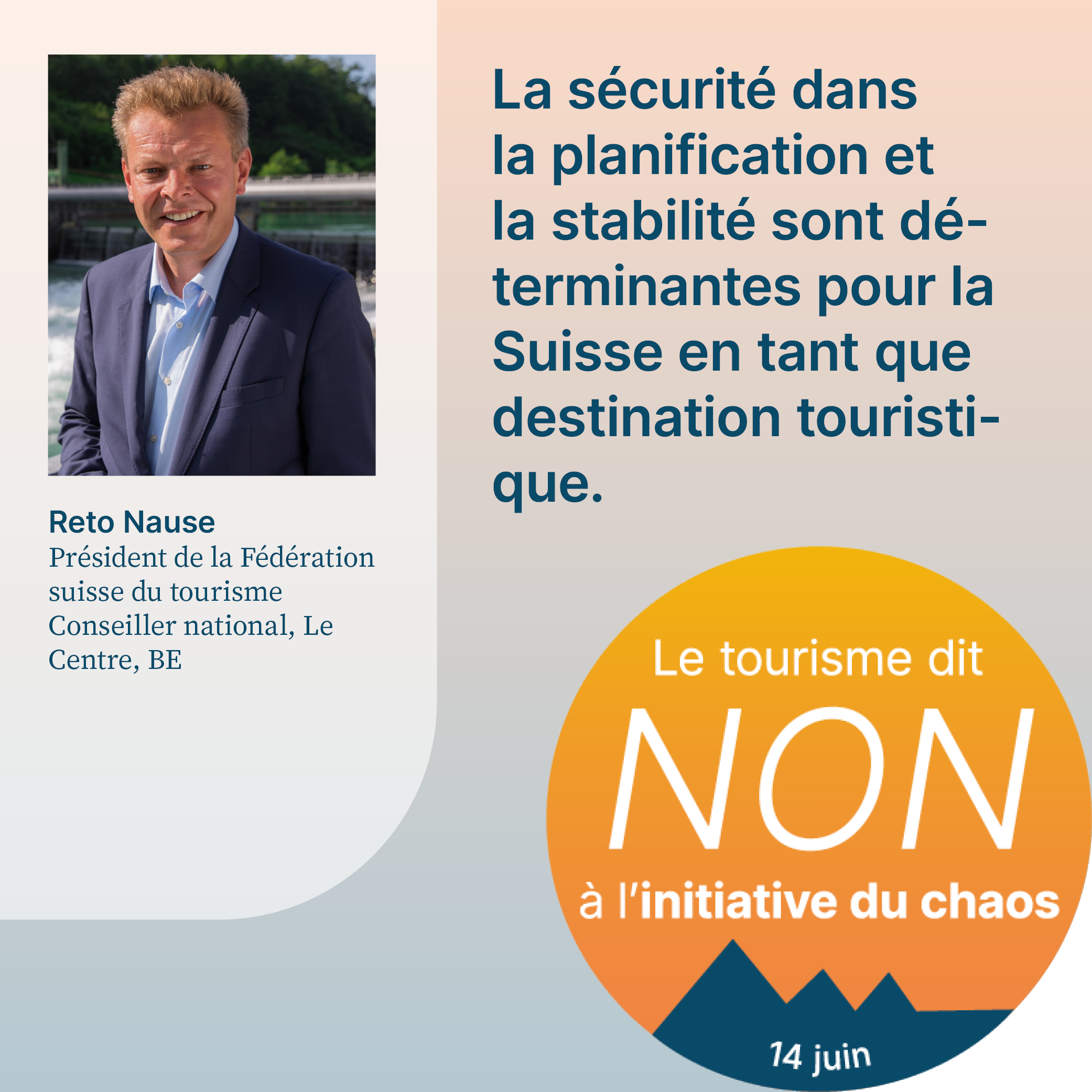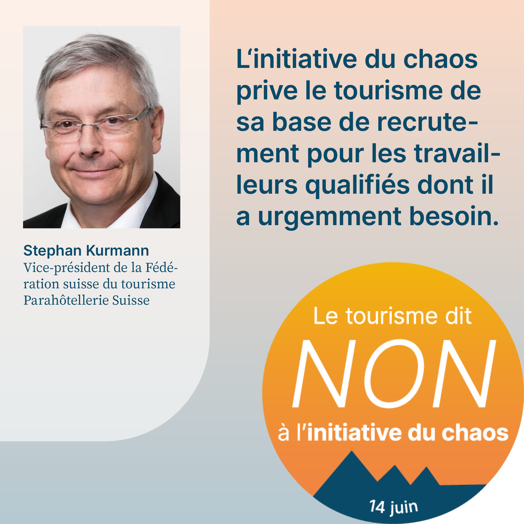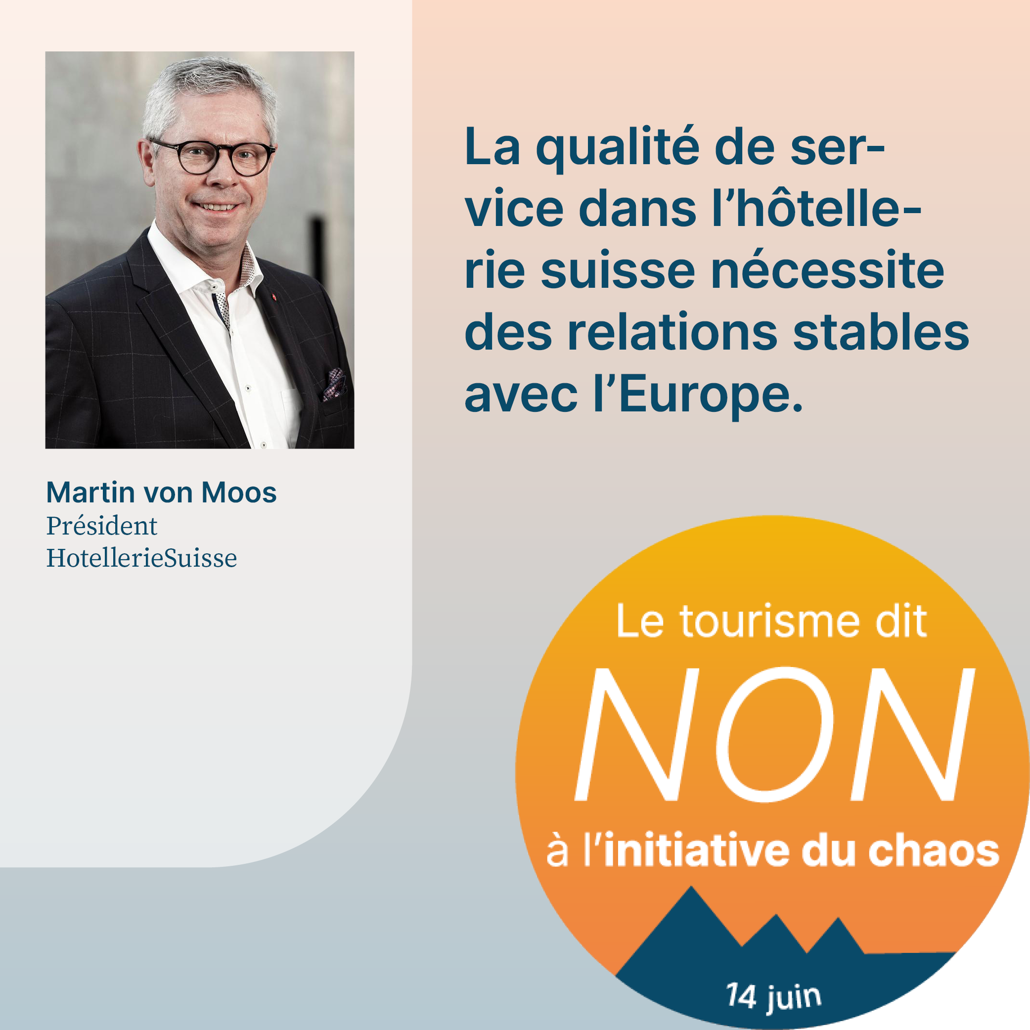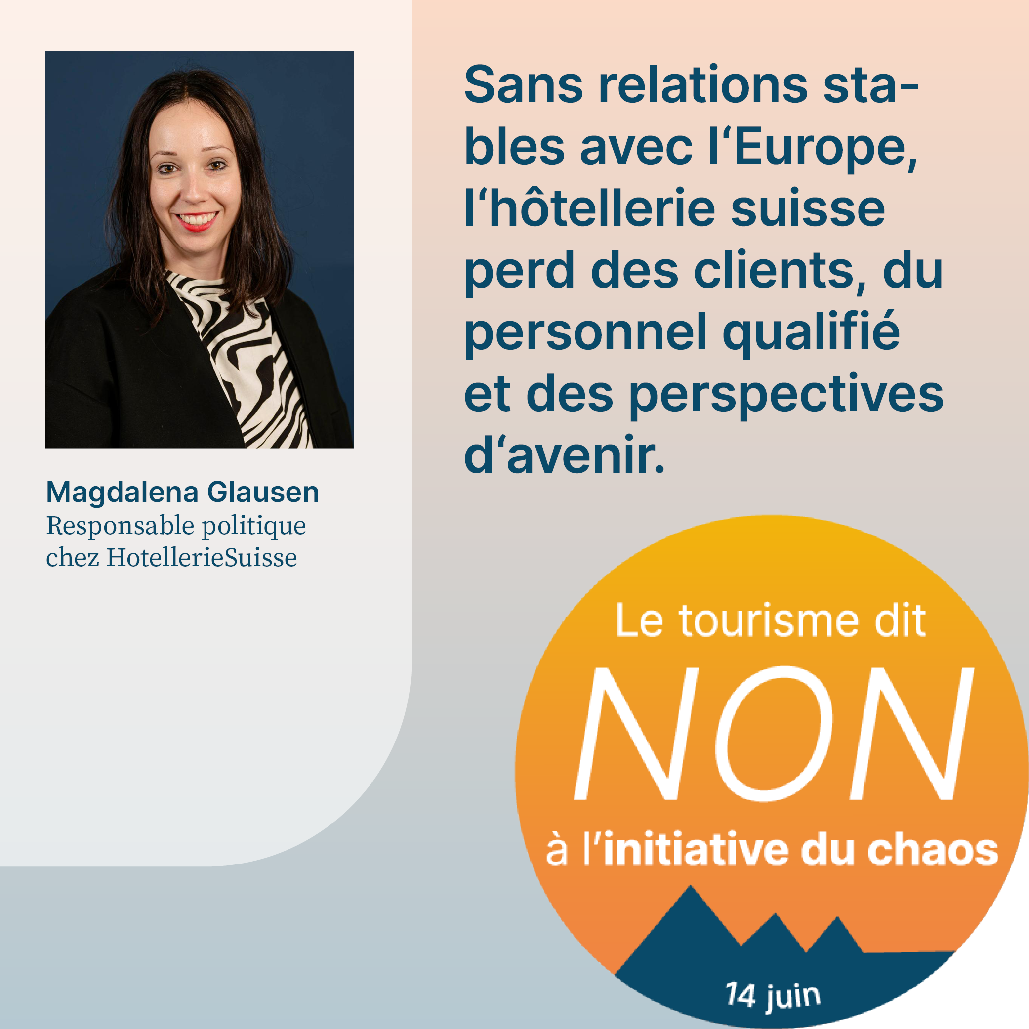 L’initiative du chaos, qui sera soumise au vote le 14 juin 2026, exige la fixation d’un plafond démographique arbitraire en Suisse. Cela aurait pour effet d’empêcher la migration liée au travail et de priver l’économie d’une main-d’œuvre qualifiée importante. Pour respecter le plafond de dix millions d’habitants, il faudrait également dénoncer l’accord sur la libre circulation des personnes (ALCP) avec l’UE. En raison de la clause guillotine, la dénonciation de l’ALCP entraînerait la caducité de tous les accords bilatéraux I. L’initiative met donc en péril la voie bilatérale de la Suisse dans son ensemble. Or, cette voie revêt une grande importance pour le tourisme. Le recrutement de personnel qualifié, les relations internationales de la Suisse et l’accès au marché intérieur sont menacés par l’initiative. Son acceptation causerait un préjudice considérable à l’ensemble de l’économie suisse, en particulier au secteur du tourisme, et provoquerait un chaos total. C’est pourquoi elle est qualifiée d’«initiative du chaos».