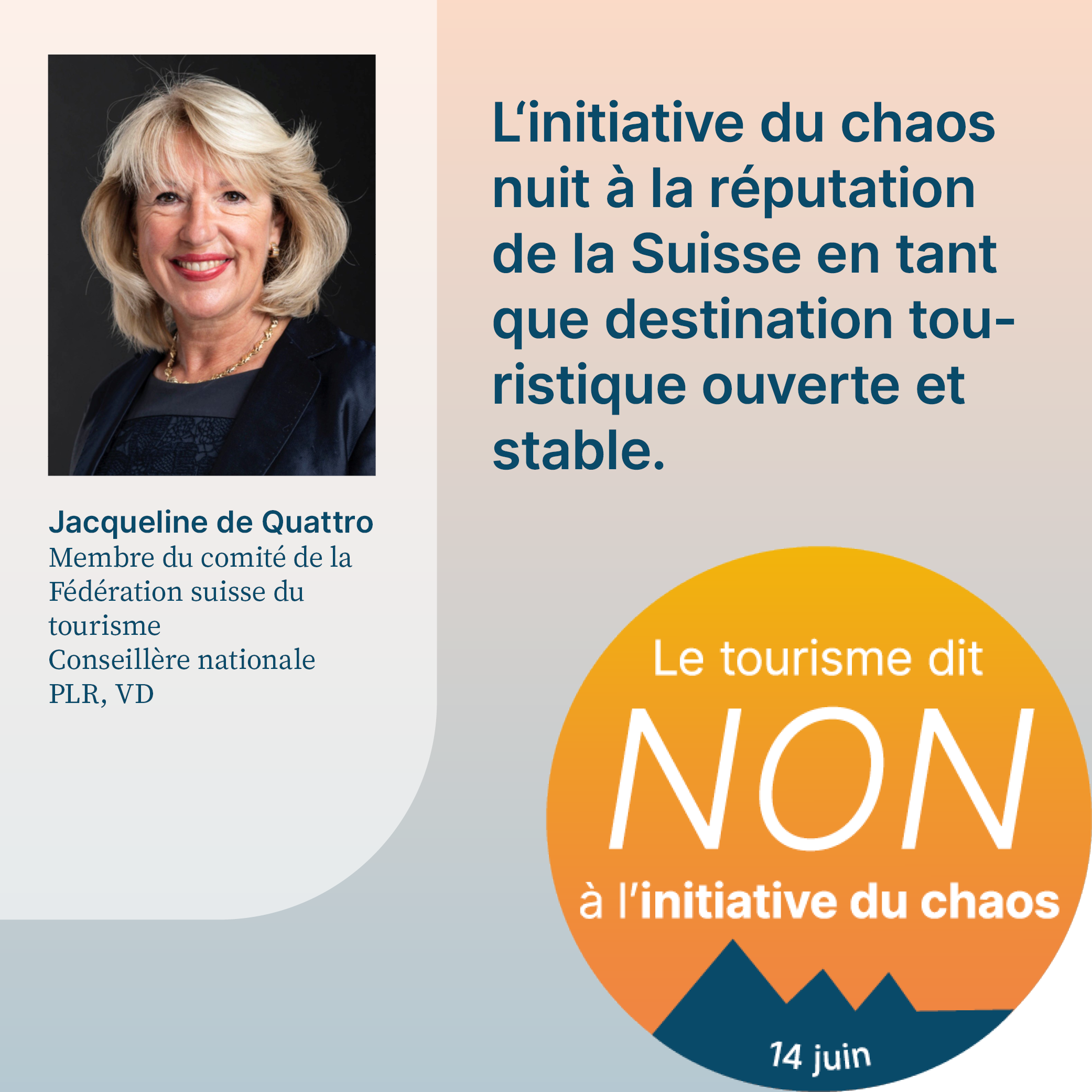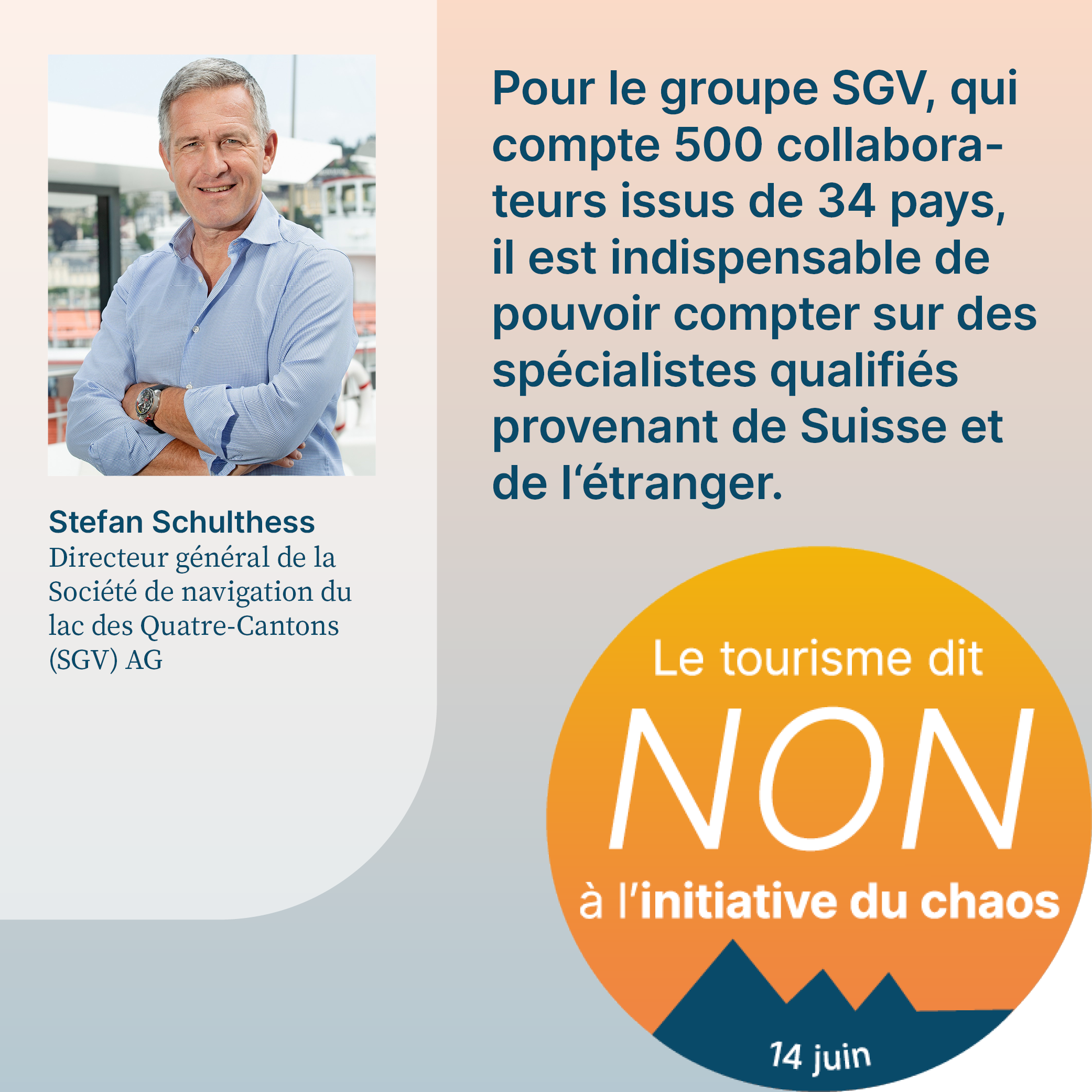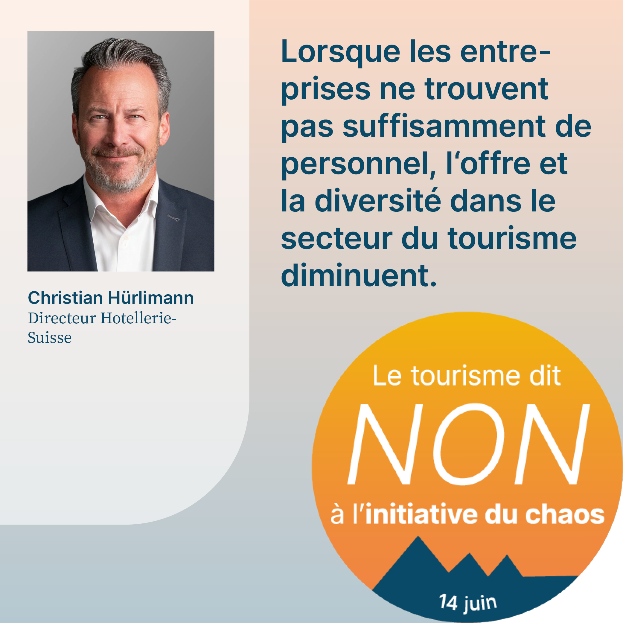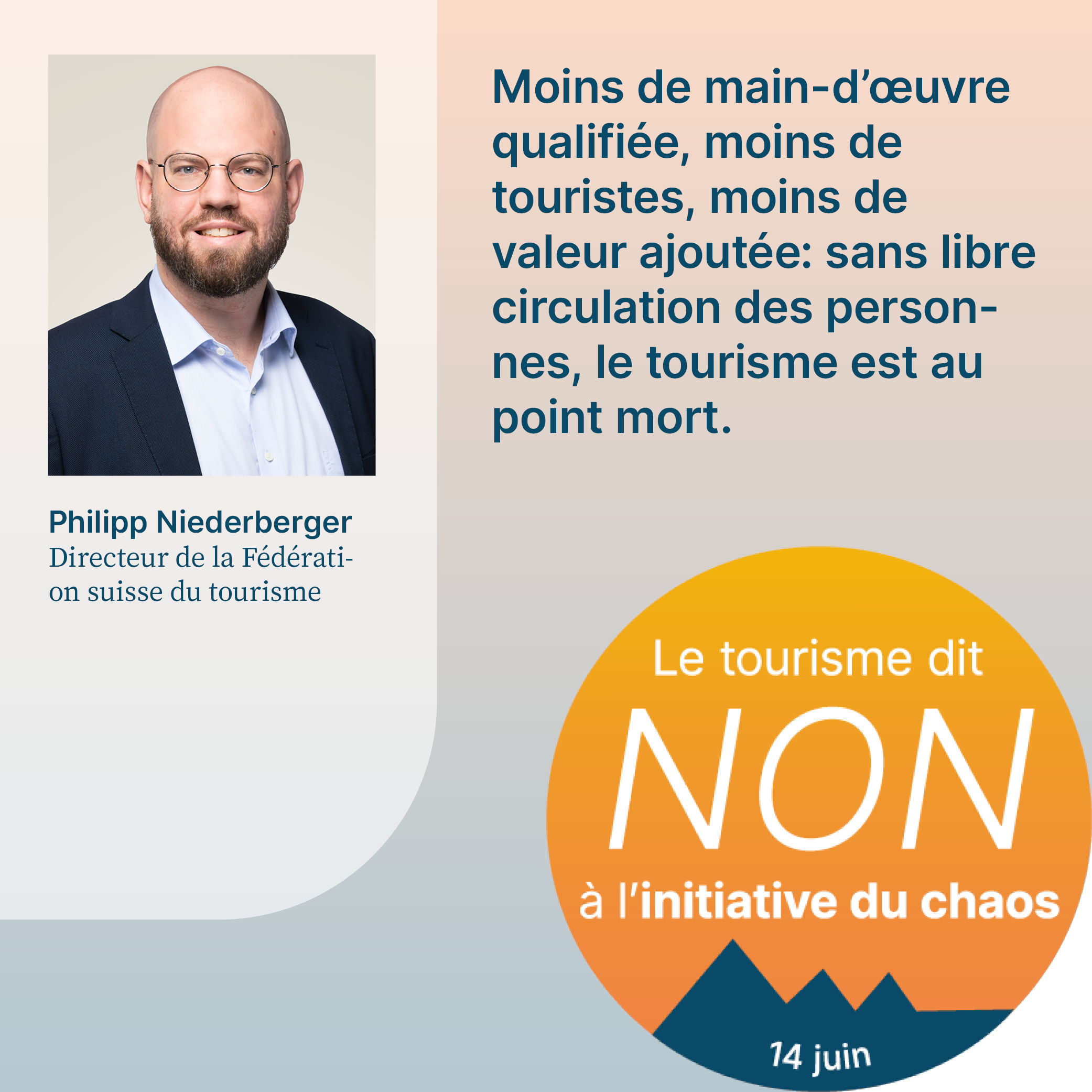 L’initiative du chaos, qui sera soumise au vote le 14 juin 2026, exige la fixation d’un plafond démographique arbitraire en Suisse. Cela aurait pour effet d’empêcher la migration liée au travail et de priver l’économie d’une main-d’œuvre qualifiée importante. Pour respecter le plafond de dix millions d’habitants, il faudrait également dénoncer l’accord sur la libre circulation des personnes (ALCP) avec l’UE. En raison de la clause guillotine, la dénonciation de l’ALCP entraînerait la caducité de tous les accords bilatéraux I. L’initiative met donc en péril la voie bilatérale de la Suisse dans son ensemble. Or, cette voie revêt une grande importance pour le tourisme. Le recrutement de personnel qualifié, les relations internationales de la Suisse et l’accès au marché intérieur sont menacés par l’initiative. Son acceptation causerait un préjudice considérable à l’ensemble de l’économie suisse, en particulier au secteur du tourisme, et provoquerait un chaos total. C’est pourquoi elle est qualifiée d’«initiative du chaos».